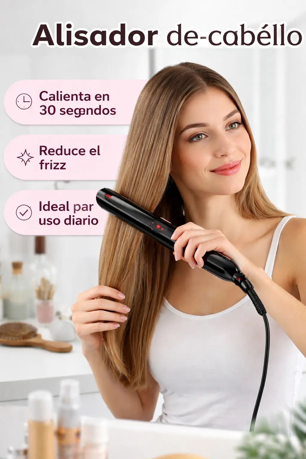 Temperatura máxima: 200°CCalentamiento rápido (30 segundos)Cable giratorio 360°Apto para todo tipo de cabello